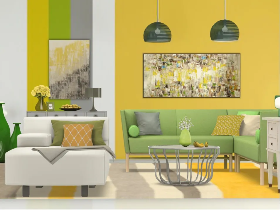 A living room with lots of colours of green, yellow, grey and white to add more vibrancy to it...