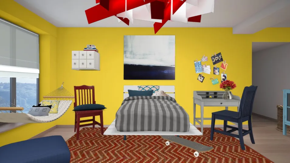 A pretty apartment bedroom. You can tell it belongs to a millenial because of the skateboard. #yolo, because thats what the kids say, amiright?