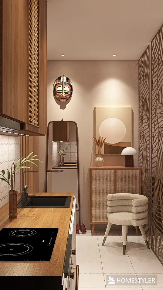 Step into a chic tropical escape, where earthy tones and bohemian flair intertwine. This studio retreat invites relaxation and adventure, adorned with warm textures and lush accents. A feminine haven, it whispers stories of distant deserts, perfect for those seeking solace away from the mundane.