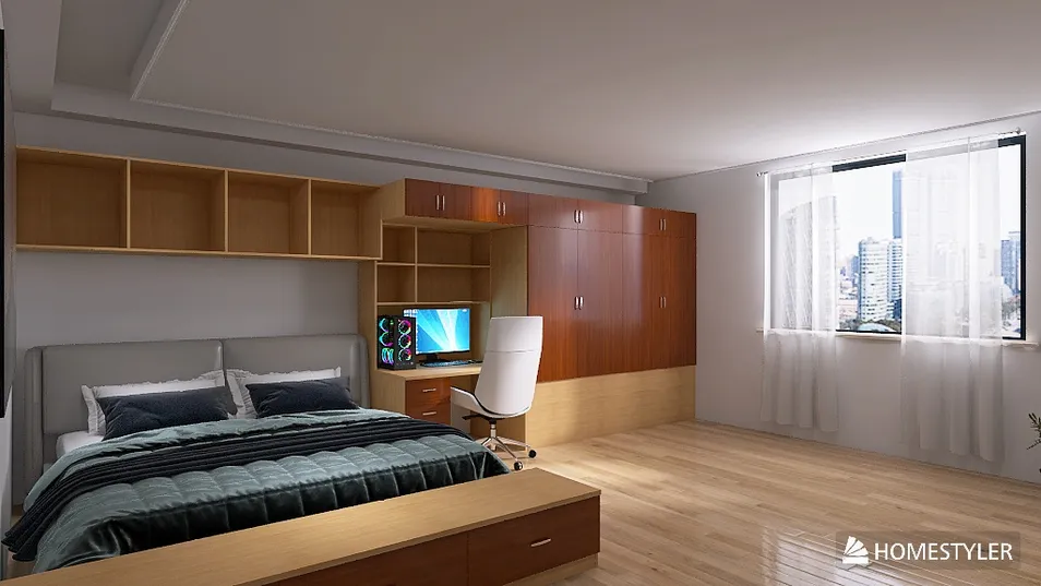 Neste quarto masculino simples, a harmonia entre o mobiliário de madeira clara e as paredes neutras cria um espaço acolhedor. A luz natural que entra pela janela destaca a suavidade dos tons, tornando o ambiente ideal para relaxar ou trabalhar. A simplicidade é a verdadeira elegância.