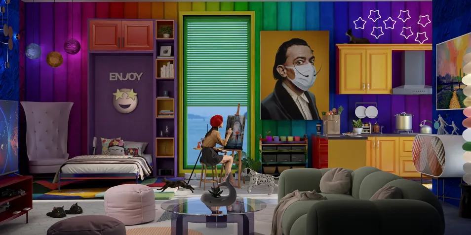 Angelina, a petite woman in her early 20s, had always had a flair for the dramatic side. Her dramatic passion was often seen as entertaining by her loved ones, and sometimes even annoying, but they also recongized is what made her a great artist. Here dramatic energy meant she wasn't afraid to go big, in life, in art, in fashion and definitely in interior design. So when it came time to get a new place, she debated and considered her options, but ultimately decided on a studio apartment that resided directly over an empty commerical space she turned into a gallery location and work place. This allowed her to easily bring her inspiration home, work late, care for her pets and resume her project, etc. No commute meant more time on the important things. The opem floor plan was inviting and the bold rainbow colors inspired her soul along with her artistic inclinations. ✨️