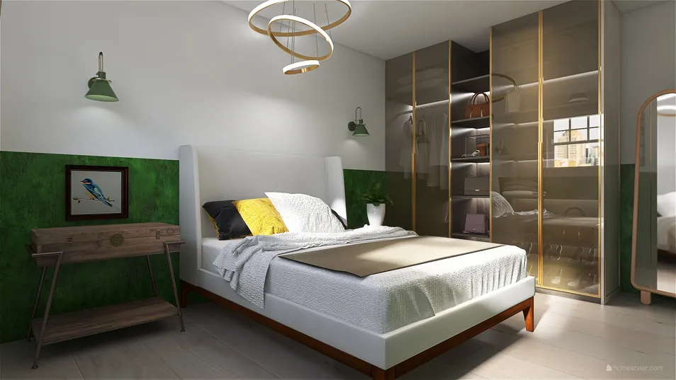 Simple yet sophisticated non-gender specific bedroom with a hint of colour and luxury.
