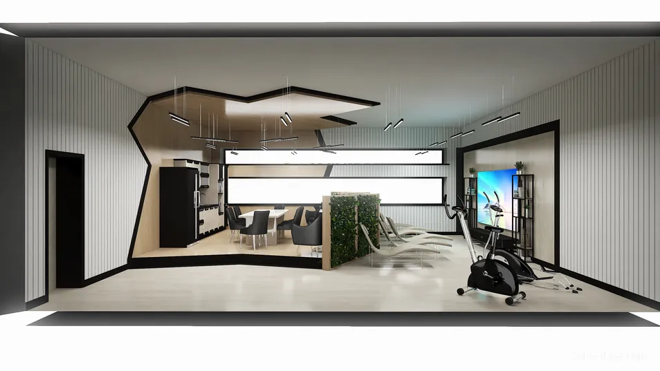 The rest room was created for the workers of the workshop with tailoring. This interior has everything that will help you get maximum pleasure and rest from hard work. There are functional zones: 1 - eating area, 2 - passive recreation area, 3 - active recreation area.