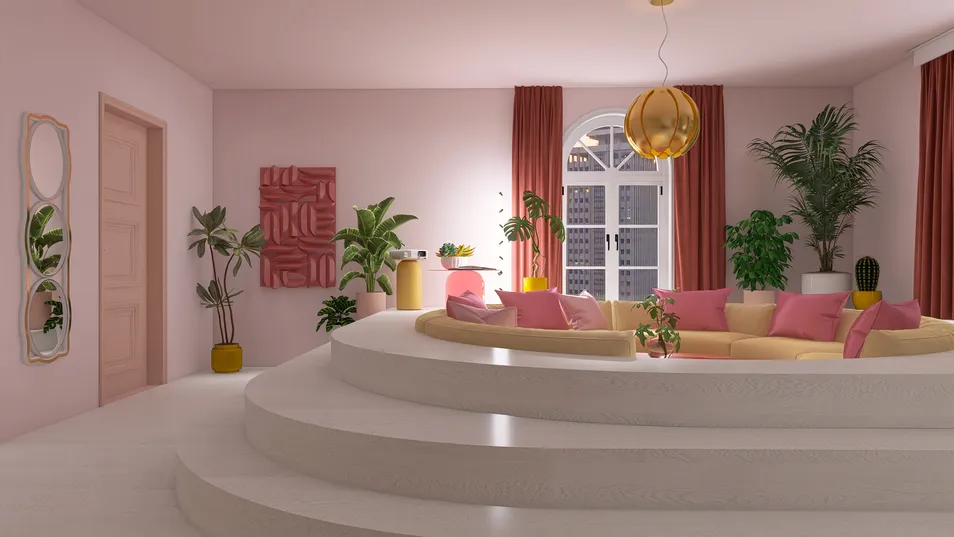 Inspired by the pastels of the '50s, this retro themed holiday rental drenches each of the rooms in a different candy-like colour. Rounded furniture and strong curves echo throughout the interior to create a whimsical and playful atmosphere.