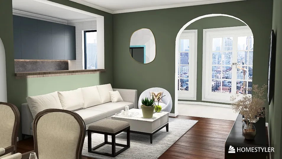 Neste apartamento pequeno, as paredes em verde sutil abraçam um espaço aconchegante, onde cada objeto é um poema visual. Cores pasteis dançam no quarto, enquanto a luz da cidade flui através das janelas, como um sussurro de histórias não contadas.
