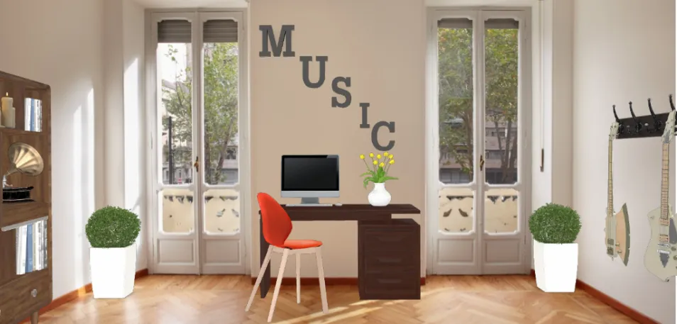 It is obviously a music room hense the name "Rome De La Musique" and the Music letters upon the wall and the guitars...so if y'all thought it was anything different than a music room, then I don't know what is going on inside your head. Anyways, it is really cool design because there is pops of color spread all around the room such as the two green plants and the red chair rjat makes the whole space feel brighter