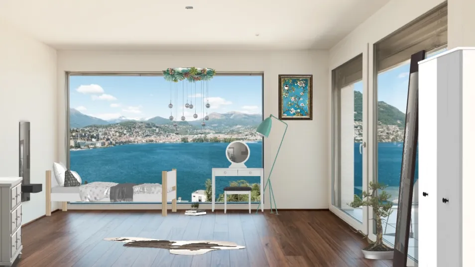 Greetings, I love making these kinds of designs. Today I will tell you about small bedrooms. Do not forget to use mirrors in your small bedrooms. In this design, I have one on the windowsill. Use chest of drawers and keep your wardrobe small. You can also use it as a desk to buy a large vanity table. I preferred the mirror with a shelf under the bedside table instead of the bedside table. Use the plant. In this design, I used a colored pendant chandelier decorated with flowers and a footed light next to the table. Use small carpets in different ways. Sorry if there is an error in translation, normally I don't know English.