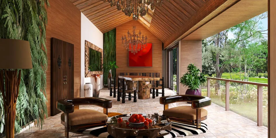 A stunning nature-inspired room where earthy elegance meets modern comfort. Dark polished wood and stone-textured flooring ground the space, while a dramatic chandelier sparkles overhead. The rustic wooden dining table and bold chairs create a striking centerpiece, complemented by plush armchairs and a zebra-print rug for a touch of glam. Floor-to-ceiling windows and balcony doors invite the lush greenery inside, blending indoor warmth with outdoor serenity.