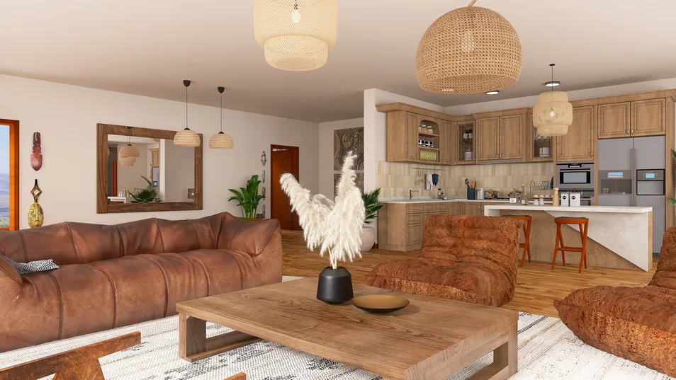 Inspired by the surrounding natural environment, this African safari lodge uses neutral colours, natural materials and animal-print wallpapers in its design. The lodge is comprised of two double bedrooms, a balcony with barbecue facilities and a large open plan living, kitchen and dining area, making it ideal for a double-date vacation or an exotic getaway for friends.