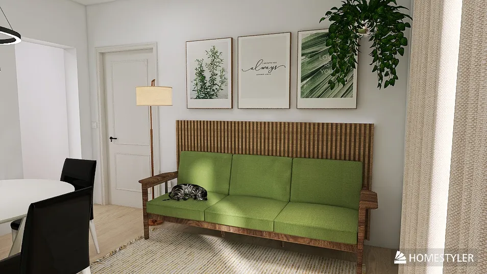 sala de casa, com tons leves e minimalista, recheada de bastante plantas para manter a harmonia.
