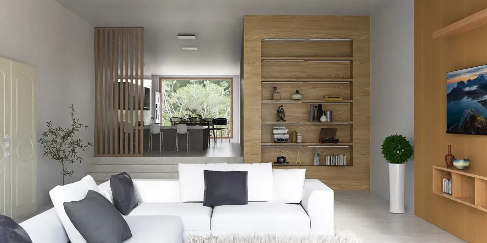 Esse é um estilo de sala rebaixada tradicional , no entanto não mostra muito sobre a sala, mas essa renderização tem como intuito mostrar o estilo de rebaixamento de sala. Ao fundo dela se encontra a cozinha dessa casa que não é muito ampla mas aconchegante. Espero que gostem!