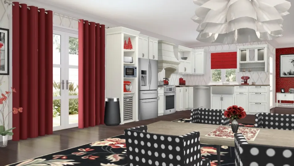 fun black & white kitchen w pops of red.❤🖤❤🖤