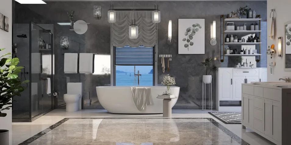 The bathroom unfolds like a tranquil escape, where soft hues cradle the senses. A freestanding tub beckons amidst textured walls, while minimalist shelves cradle curated beauty elixirs. Each detail whispers harmony, inviting you to linger in a moment of stillness.