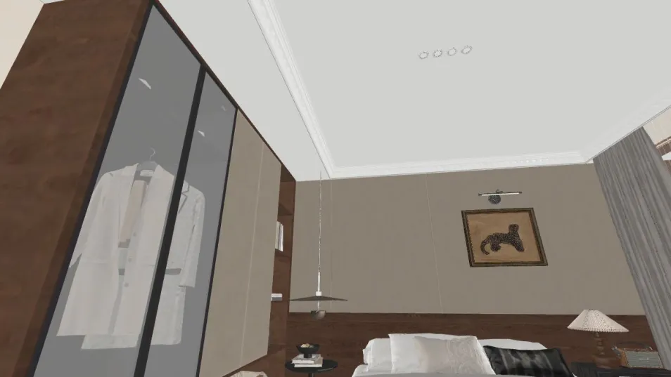 The room melds clean lines with subtle textures, where a stark wardrobe holds a crisp suit, hinting at unfulfilled potential. A solitary light fixture dangles, illuminating a space caught between ambition and a lingering sense of solitude.
