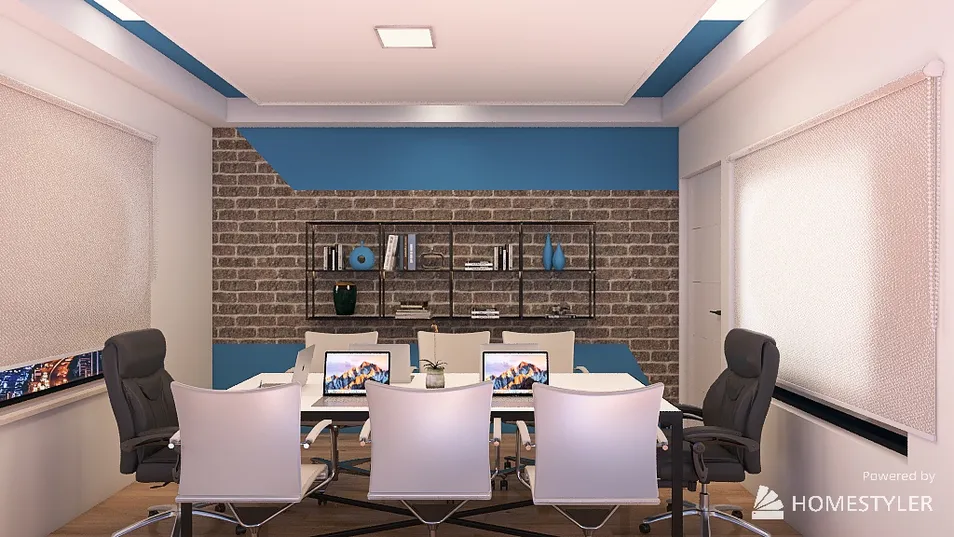 Embracing minimalism as per our client's request, we've created a workspace that exudes simplicity and functionality. The feature wall boasts a striking brick wallpaper, complemented by accents of blue for a touch of modernity. Wall-mounted iron shelves provide ample storage without overwhelming the space, while a freestanding iron shelving unit on the opposite wall adds depth and character. The Tranquil outside area offers escape for brainstorming or unwinding. The accent front wall, painted in a bold blue with pops of yellow, sets the tone for creativity and innovation.
