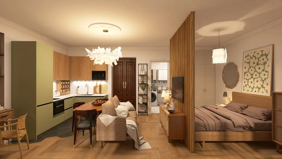 This studio apartment, located in Milan (Italy), is 30 m2 and is fully furnished of everything that is needed, a big kitchen, living, bedroom, bathroom and even an office zone.