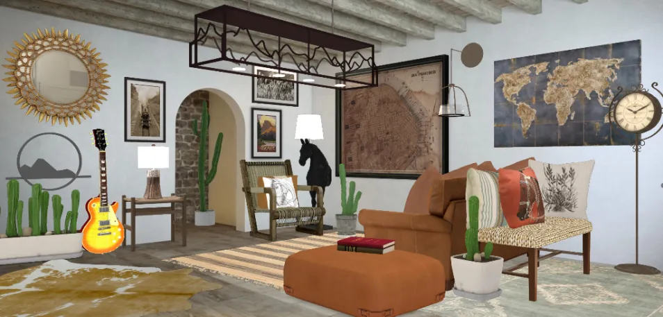 a western style room that has the elements of the desert such as mountains, dusty browns and oranges, cacti and guitars for those late night seshes.