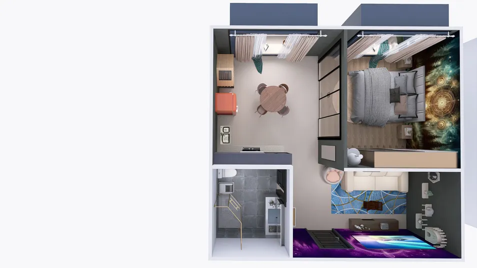 In questo rifugio modulare, il pavimento ondulato di blu sembra danzare sotto il peso di un pensiero incompiuto, mentre pareti trasparenti invitano a un dialogo silenzioso tra l'interno e l'esterno, come se le città invisibili di Calvino stessero sussurrando segreti dimenticati.