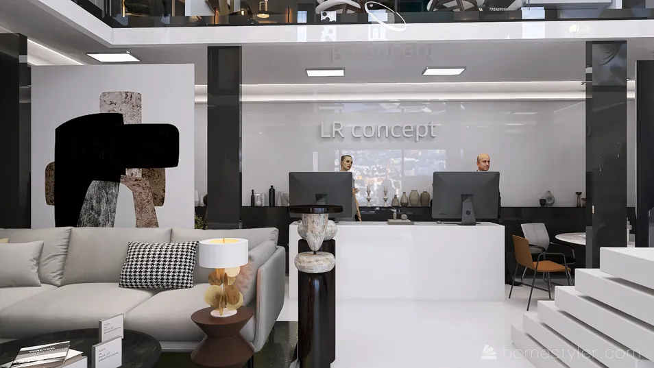 I present a project from the Homestyler store "Conceptual living room". My LR concept is a store of designer furniture and living room accessories. The space is built on two levels. The concept - a stylistic group of armchairs, sofas, tables, lamps, is presented as a work of art in its specially made area of white and black stone and is installed on a podium made of innovative plastic in gold tones. In the store, you can order the design of the living room and choose a style solution from the constantly replenished collections of furniture from the world's leading designers.