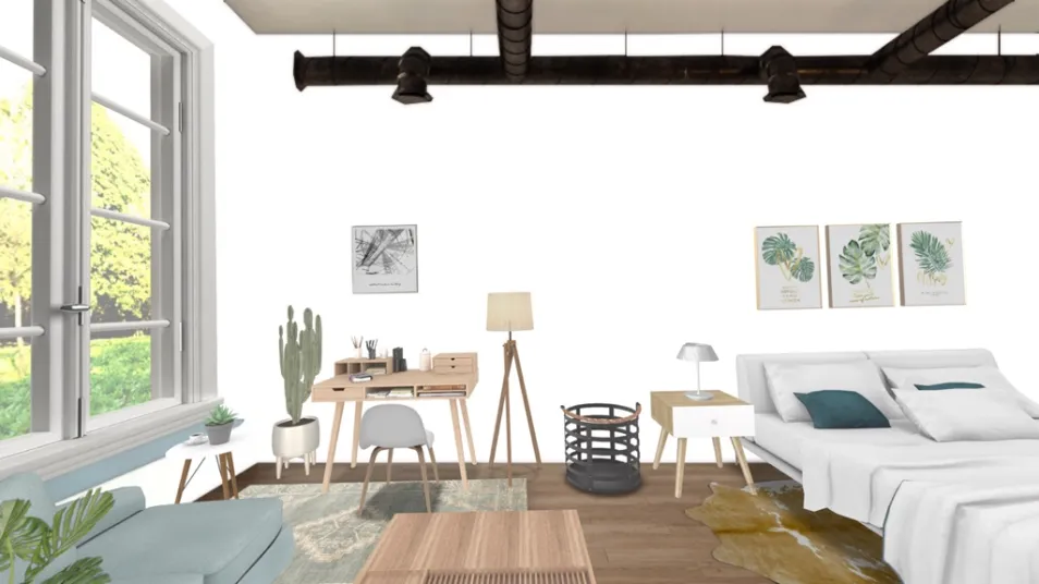 This was inspired by a minimal study space I found around Pinterest and I made my own version of bedroom with study space. I wanted to try out neutral colours to create a modern interior.