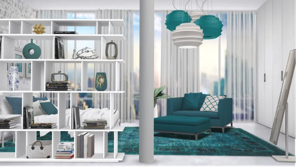 Floor to ceiling windows with a gigantic city view and white on white (and a teal pop) gives an open and airy larger than life feel to this studio space.