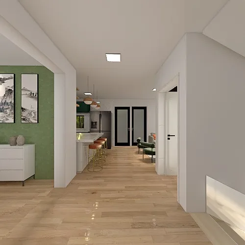 A modern dynamic space, with 3 floors, decorated in an art decor direction with green - terracotta base accompanied with navy blue and wood finishes, and boho elements.