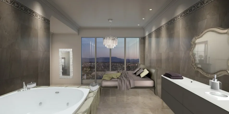 es una suit en con cómoda cama y gran jacuzzi, en colores piedra, mármol blanco y detalles brillantes.