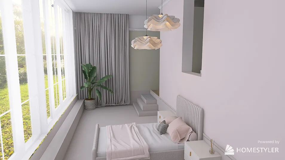 A master bedroom split into two. Top half contains wardrobe storage hidden behind this partial-wall. The bottom half can be accessed by steps either side of the bed, leading down to the "sunken" bedroom.