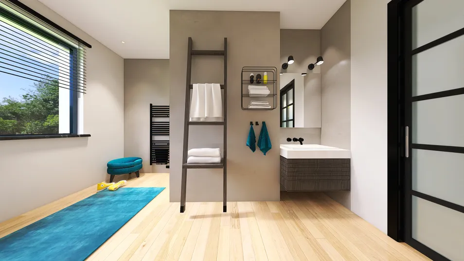 Modernes Design mit fugenlosem Bad. Naturtöne kombiniert mit der Statement Farbe "Petrol"