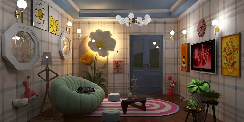 Another early morning/middle of the night design. (No, I do not sleep well, thanks for asking 😂) I imagine this is a tiny home lived in by a cat loving, pastel obsessed, extrovert. I wanted to make it seem as if a doll house became life sized, with the energy of a dream like childhood bedroom. I personally would love to hang out in here with some kitties!