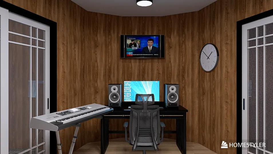 In a small music studio, the air thick with the scent of whiskey, a lone keyboard waits, flanked by complete rock instruments. Shadows of unfinished melodies linger, while the clock ticks, counting the moments lost in the silence of creation.