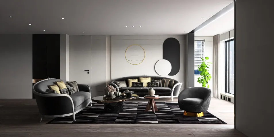 In this sanctuary of monochrome grace, velvet whispers secrets of grandeur, while gilded curves mock the mundane. A single plant, a silent witness, stands amidst the austere, reminding us that even in minimalism, decadence finds its voice.