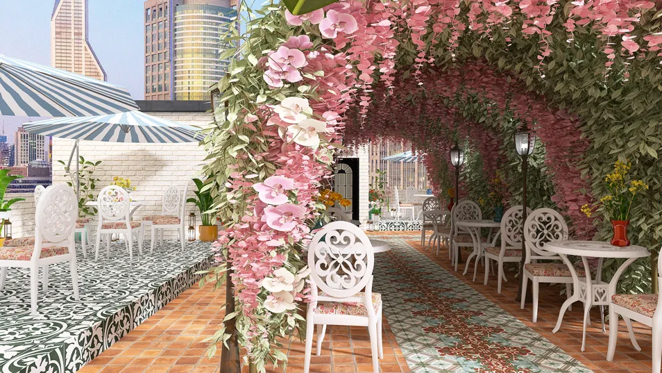 This colourful, bright bar and cafe is comprised of a rooftop garden bar and an indoor cafe. Inspired by the notion of a secret garden, an abundance of plants, flowers and archways are used throughout both spaces to create intimate seating areas and produce a garden-like atmosphere. Boldly patterns and tiling are used on the walls and floors and a mixture of classic garden furniture and traditional furniture is used to further the ambiance of an English garden.