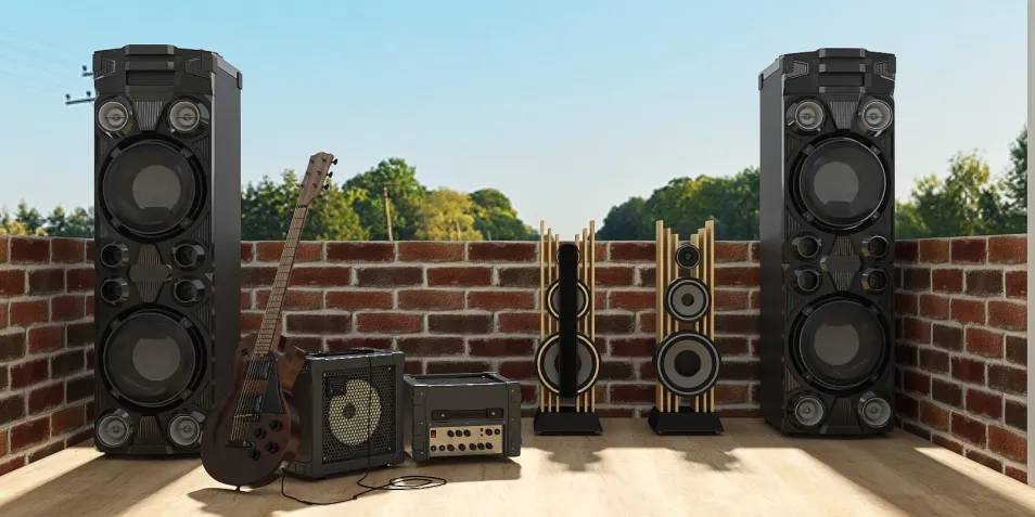 In a sunlit corner, towering speakers resonate with memories, while a lone guitar leans, echoing silent chords. The brick backdrop cradles the whispers of forgotten melodies, crafting a sanctuary where sound and stillness entwine, inviting the soul to dance in rhythmic isolation.