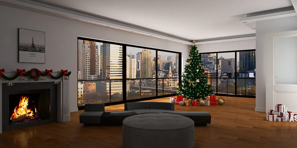 In a room where glass meets warmth, shadows dance upon polished wood, whispering secrets of the city outside. A Christmas tree stands sentinel, adorned with dreams not yet realized, while the flames flicker—a reminder that even in the glow, absence lingers like an unanswered question.