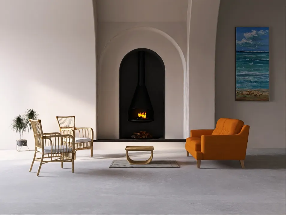 In a space where curves whisper secrets of transformation, the orange sofa cradles dreams like a buoy drifting in a sea of silence. Shadows dance upon walls, echoing the invisible cities of memory, while a flickering flame murmurs tales of ephemeral warmth.