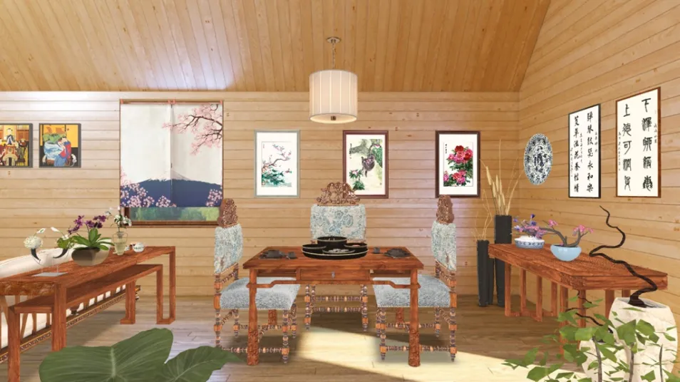 Traditional furniture, art, and foliage pieces are arranged in a pleasingly modern way to give this lovely dining room a traditional, yet open and modern feel.