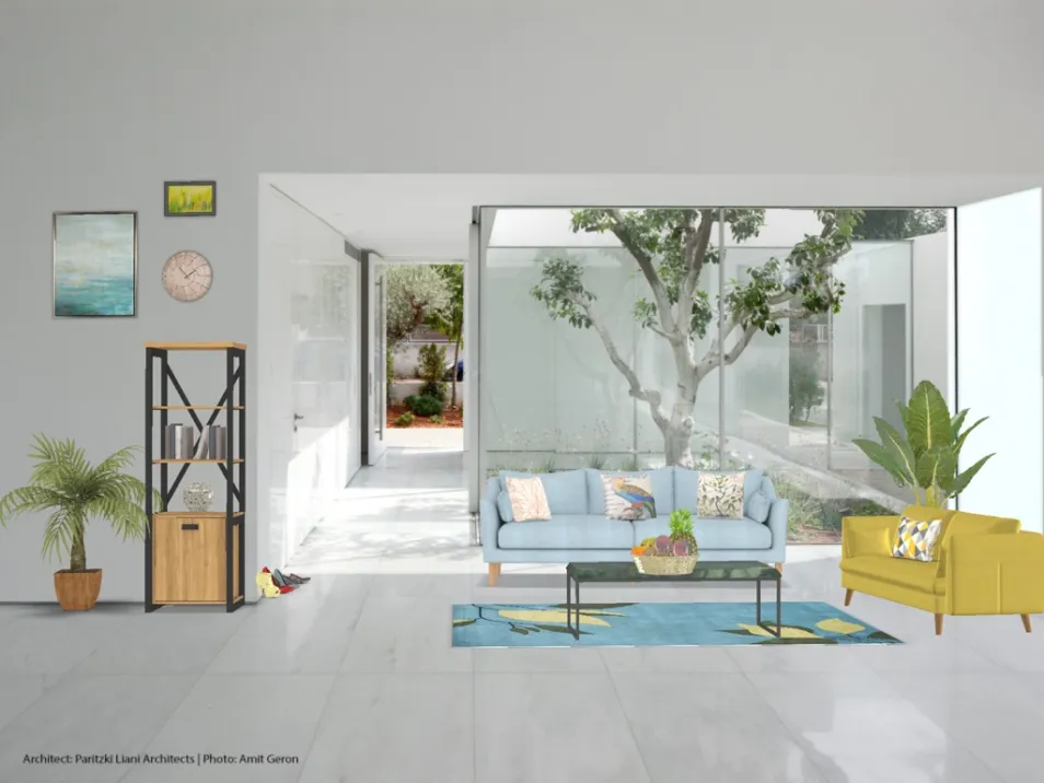 This is a tropical and sleek living room and chill area. It is simple in being complicated, and remains one of a beautiful beach. The bright colors stand out against the muted tones of the walls. This is part of a series.
