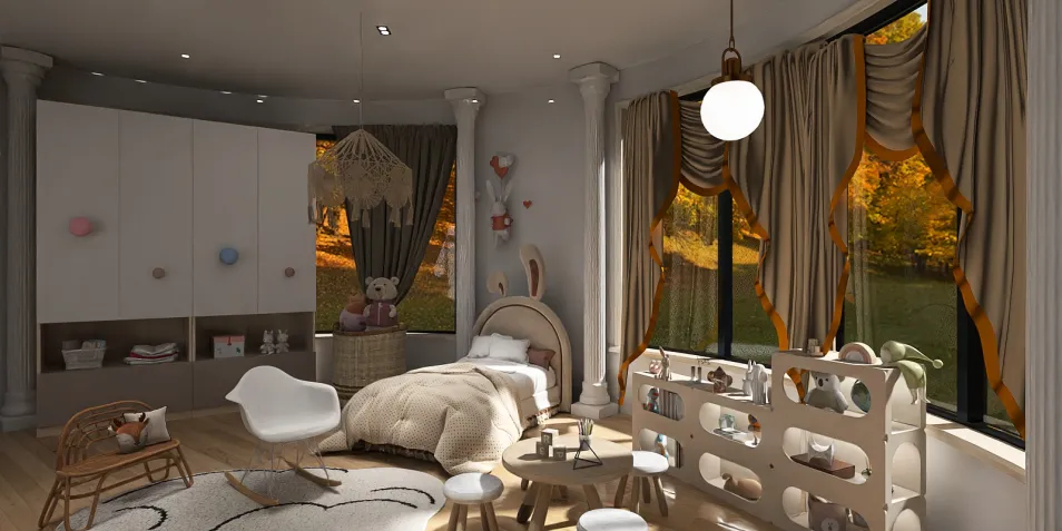 Neste espaço, a luz do outono se filtra suavemente pelas cortinas, enquanto o suave toque do algodão e o calor da madeira criam um lar. Os brinquedos, como sonhos à espreita, esperam por risos e histórias, enquanto um urso de pelúcia observa tudo, guardião da inocência.