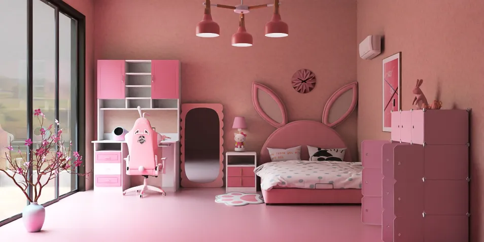 En esta habitación, el rosa envuelve todo como un suave abrazo. Los muebles, con formas redondeadas, parecen susurrar secretos de alegría. Un conejo en la cama y flores en el escritorio recuerdan que la infancia nunca se aleja del corazón.