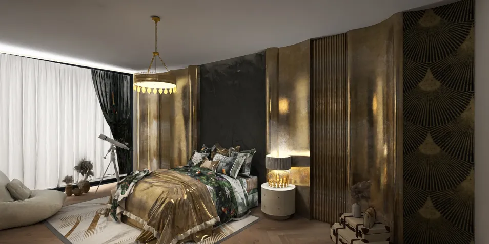 En un rincón del mundo donde el lujo se entrelaza con la naturaleza, este dormitorio despliega un abrazo de terciopelo dorado y sombras danzantes. Las paredes, como susurros de un pasado glorioso, parecen reírse de la simplicidad, mientras una lámpara de ensueño vigila el descanso de los soñadores.