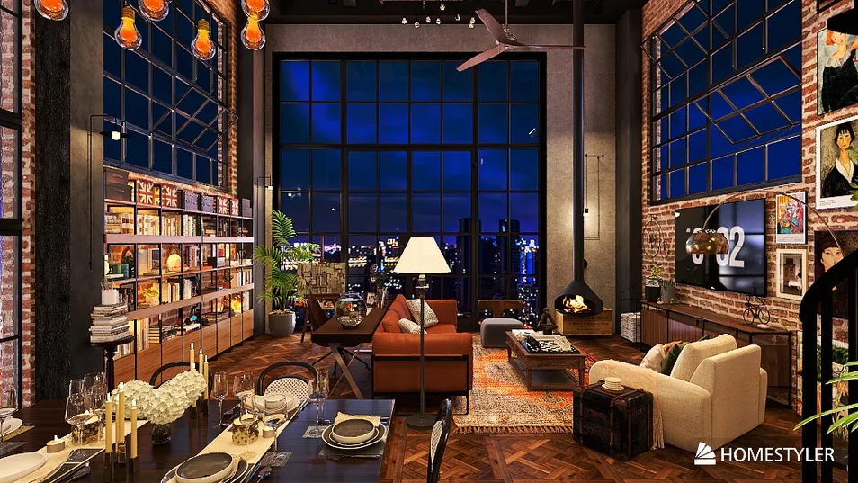 This loft design captures the essence of dynamic downtown living by seamlessly integrating industrial aesthetics with a spacious, light-filled environment. Inspired by the raw beauty of exposed brick walls and authentic industrial elements, the space celebrates urban character while prioritizing comfort and psychological well-being. Wide open windows frame breathtaking views of the city skyline, flooding the interior with natural light and creating a strong visual connection with the vibrant city life outside. A standout feature is the walk-in wardrobe area, separated by a trendy glass block partition. This addition introduces a modern touch while maintaining the open and airy feel, allowing light to pass through and visually expanding the space without sacrificing privacy. The textured glass blocks add subtle architectural interest and reflect the loft’s commitment to blending functionality with style. The open-plan layout maximizes limited square footage, encouraging fluid movement and multi-functional use of every corner. The exposed brick textures combined with metal accents and rustic wood finishes evoke an authentic industrial vibe, balanced with cozy textiles and warm lighting to cultivate a welcoming atmosphere. Materials are carefully selected to reflect durability and tactile richness, enhancing the loft’s warmth without sacrificing the sleek urban feel. This design emphasizes transparency and spaciousness through its floor-to-ceiling windows, the glass block partition, and minimalist partitions, enabling residents to feel both connected and at ease in their home. The loft becomes a personal sanctuary amidst the hustle and bustle, where modern living meets timeless industrial charm. It perfectly embodies the challenge’s vision of a downtown home that is both functional and a restful retreat, blending the vibrant rhythm of city life with serene living spaces.