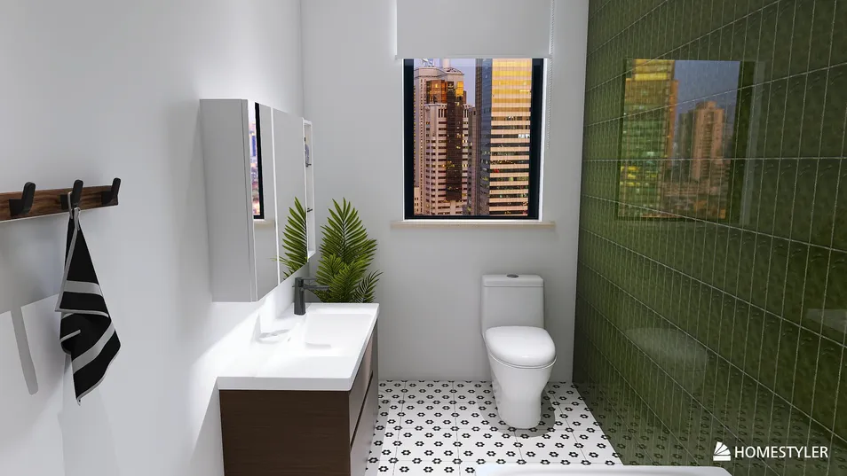 In the heart of the city, this bathroom breathes tranquility. The green tiles reflect a living nature, while the sleek fixtures offer modern elegance. A glimpse of skyscrapers through the window reminds you of the bustling world outside, yet here, serenity reigns.