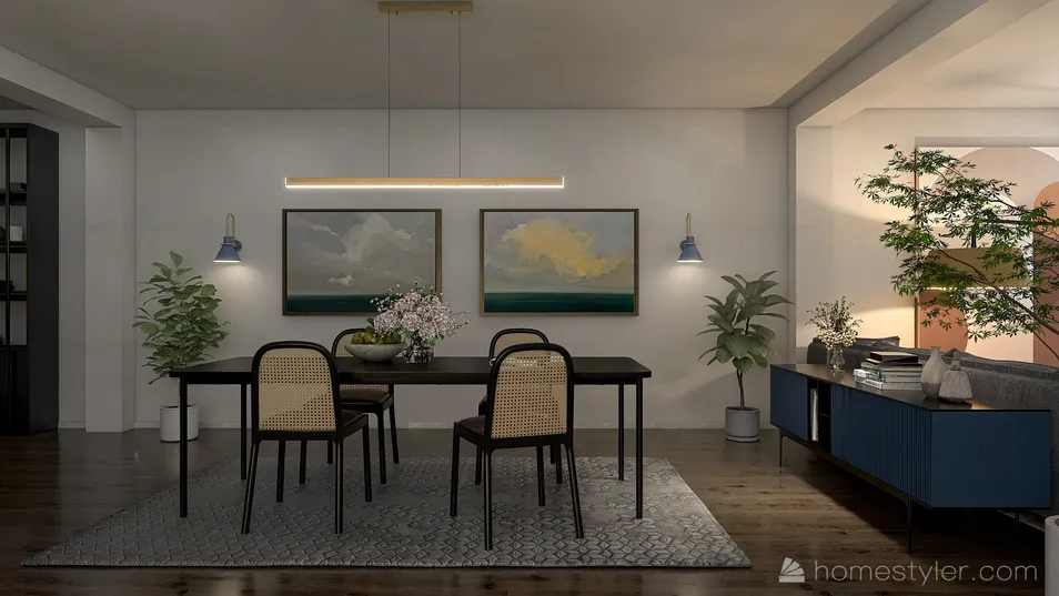 Dinning, living and office area in one room. All furniture is made of natural materials. Mainly wood, cotton and linen. Easy cleaned and in practical colours.