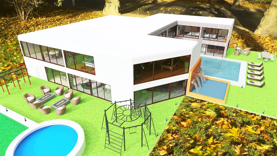 una cómoda y amplia casa en medio del bosque para unas vacaciones cómodas y relajantes. incluye: 5 dormitorios, 1 cocina, 3 comedores, 1 sala de televisión, 1 recibidor, 1 zona de lectura, 2 albercas, 3 baños, 2 pisos, 1 área de recreación, 1 balcón y 4 escritorios con computadora.