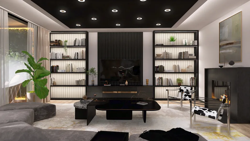 A luxurious 187m² apartment designed with a palette of black, white, and neutral tones, subtly enriched by soft greens to evoke a refined blend of elegance and natural serenity.