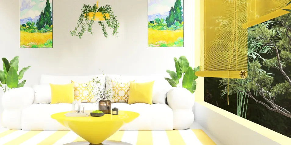 In this sun-drenched room, vibrant yellows dance with lush greenery, inviting warmth and joy. The playful circular coffee table contrasts with the soft, inviting sofa, creating a harmonious escape. Here, every detail whispers tranquility, urging you to pause and savor the beauty around.