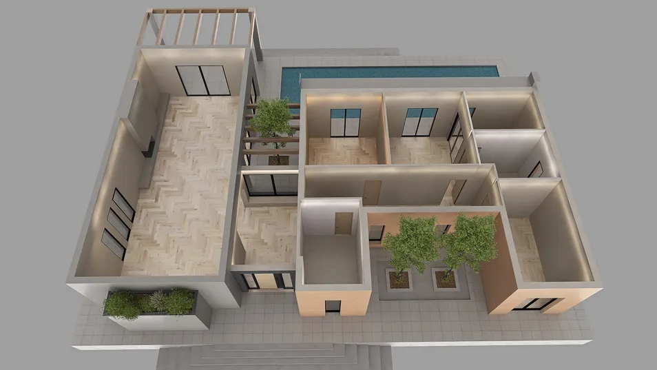 Villa contemporánea de una planta . Consta de salón comedor con cocina abierta, tres dormitorios y dos baños.