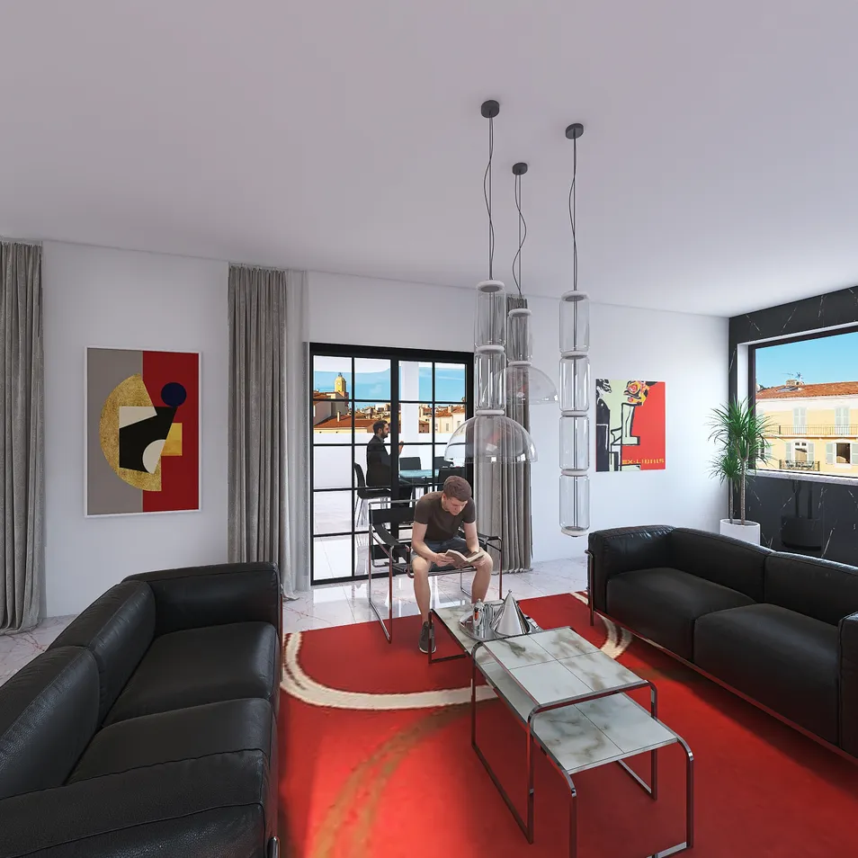 Living room with balcony. 3 windows and a french door overlooking the balcony. The main used colors are white, black, metal grey and red (using the rule 60-30-10). I furnished the historic home of Villino Tipo B, designed in the 1920s by the Italian architect Adalberto Libera, in Ostia (a place near Rome).