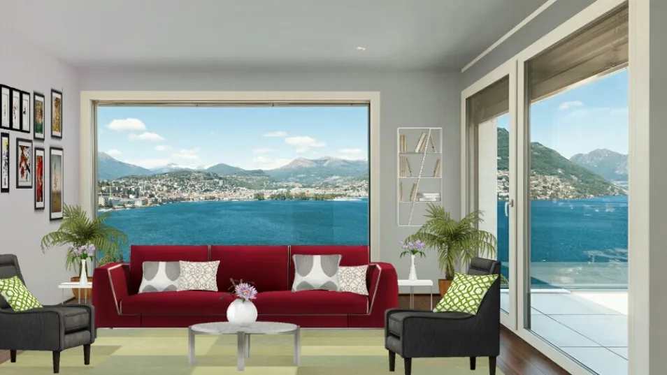 Coloquei um sofá vermelho porque achei lindo e para não ficar muito cheguei, coloquei poltronas de cor escura, tapete com pouca cor e almofadas claras.